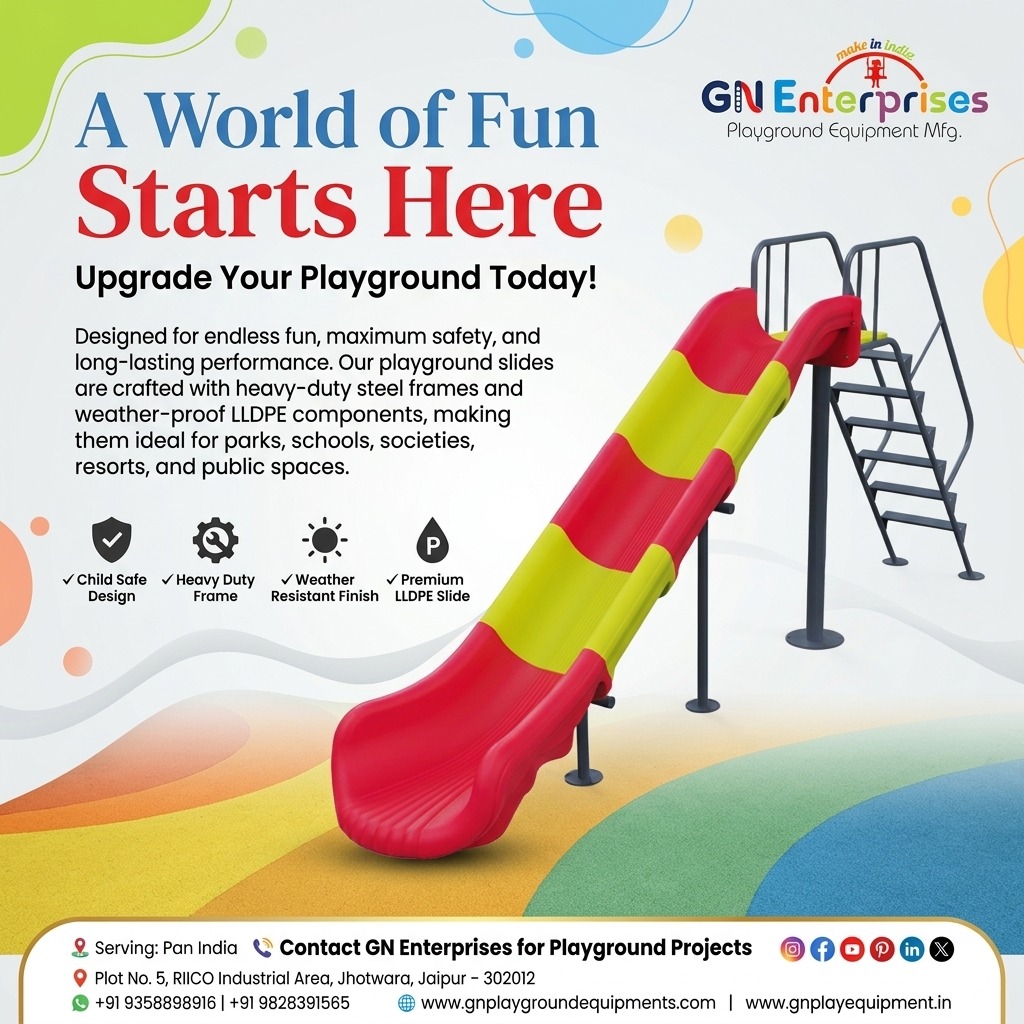 At GN Enterprises, we are passionate about transforming parks, schools, residential societies, and recreational centers with state-of-the-art multiplay systems, slides, swings, seesaws, spring riders, outdoor gym equipment, and sports infrastructure.